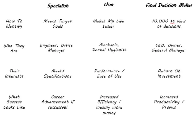 The second kind of buyer are the users. The user buyers are those that will be operating the product. They are usually dental hygienists, nurses, and mechanics. These are the people that are really key people to get engaged as they are the ones using the products all the time. They are the most important people to engage to understand how the competition is doing. They can tell you what they like and don’t like with application. Keep them in mind when working through the selling process.